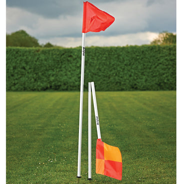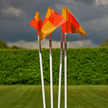 - Set of four foldable corner flags with Orange and Yellow quadrant pattern – essential match-day kit